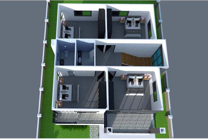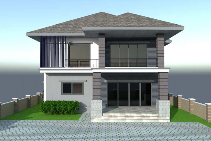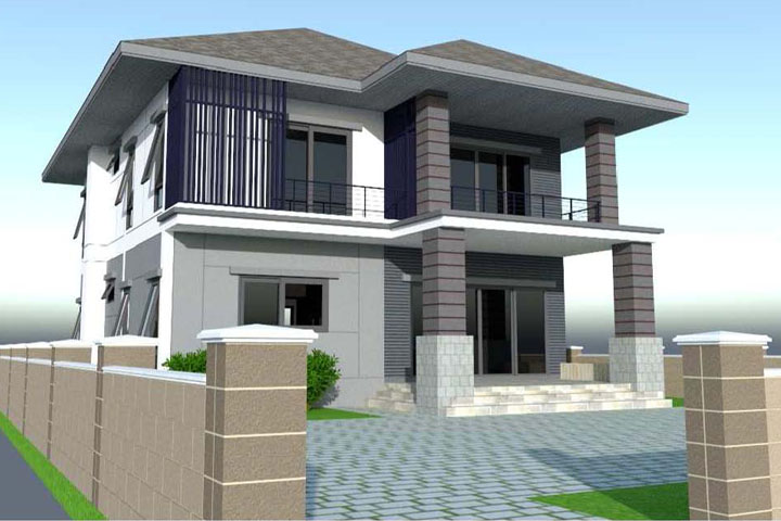 บ้าน 2 ชั้นเป็นรูปแบบที่อยู่อาศัยที่เหมาะสำหรับครอบครัวขนาดกลาง-ใหญ่ ช่วยเพิ่มพื้นที่ใช้สอยบนที่ดินจำกัด โดยแบ่งสัดส่วนชัดเจน ชั้นล่างเป็นพื้นที่ส่วนรวม (ห้องนั่งเล่น, ครัว) และชั้นบนเป็นพื้นที่ส่วนตัว (ห้องนอน) โครงสร้างใช้คอนกรีตเสริมเหล็ก แบ่งเป็นห้องนอนหลัก, ห้องนอนรอง, ห้องน้ำ, ห้องทำงาน, และพื้นที่ระเบียง